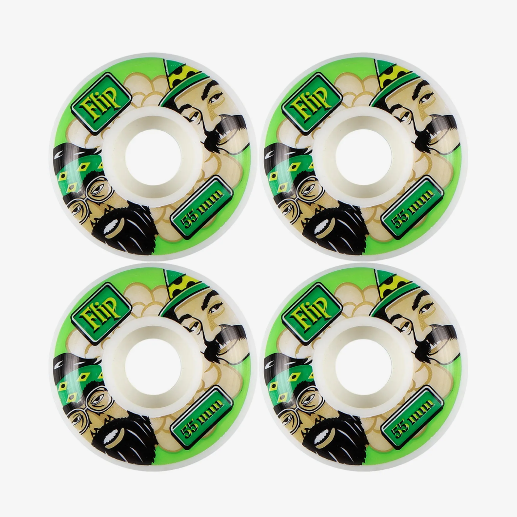With a 55mm diameter and a rock-solid 99A hardness, the Flip Cutback Cheech & Chong wheels are perfect for technical skating. The classic shape in the back and Flip sidecut in the front provide an ideal balance of stability and agility, making these wheels a top choice for street and park skating.